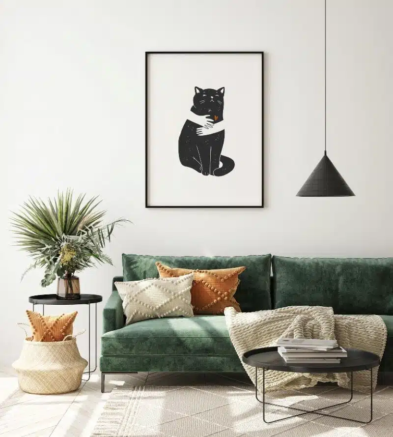 Une autre alternative serait d’opter pour de jolis tableaux représentant des chats. Dans une ambiance moderne, vous pouvez choisir un tableau avec une tête de chat avec des lunettes de soleil, tandis que pour une ambiance minimaliste et cosy, préfèrez un tableau en line art. Cette dernière est d’ailleurs très tendance en matière de décoration.