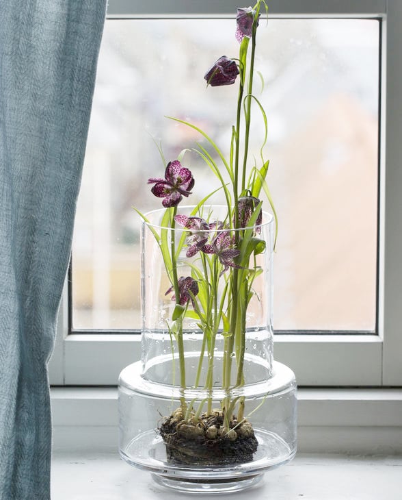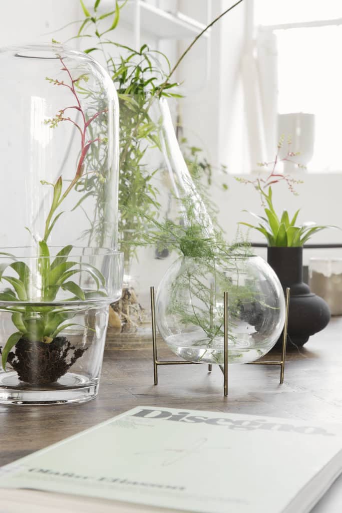 Le vase transparent permet aussi d’observer le système racinaire des plantes. On peut alors décider, sur un coup de tête, de replanter la tige dans le jardin ou de la laisser exposée, comme un tableau vivant.