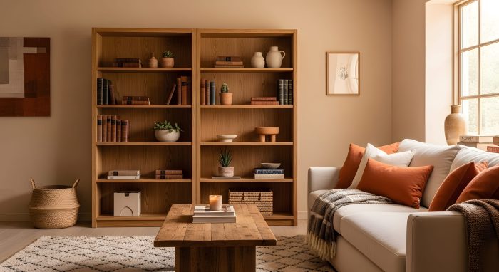 Sur le plan esthétique, une bibliothèque en bois massif devient souvent le cœur d’une pièce. Elle confère une atmosphère chaleureuse et raffinée en transformant un simple espace de lecture en un véritable lieu de vie.