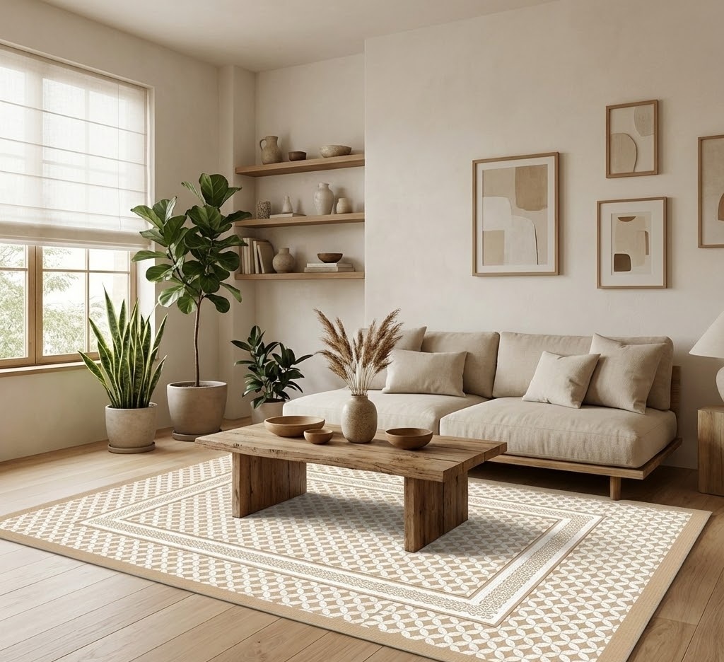C’est souvent le point complexe du style Japandi : on rêve de sols en tatami ou de grands tapis en laine bouclée partout. Cependant, la réalité de la vie quotidienne (enfants, animaux, cuisine) impose des limites.